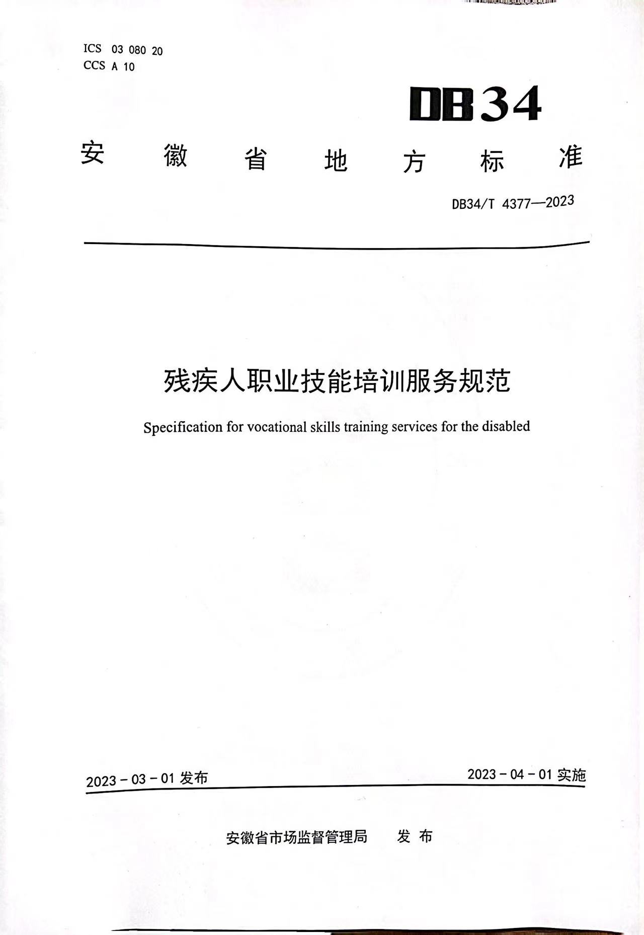 由安徽省市场监督管理局依法批准,安徽创新人力资源研究院作为参编单位之一编制的《乡村振兴职业技能大赛服务工作规范》DB34/T 4378-2023、《残疾人职业技能培训服务规范》DB34/T 4377-2023两项地方标准于2023年4月1日正式实施。